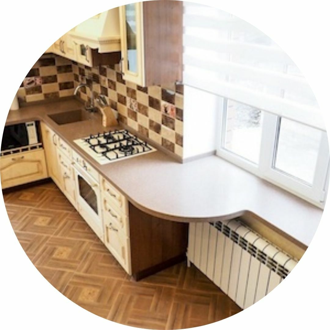 Столешница переходит в подоконник без швов. Обеспечим конвекцию от радиатора у окна.